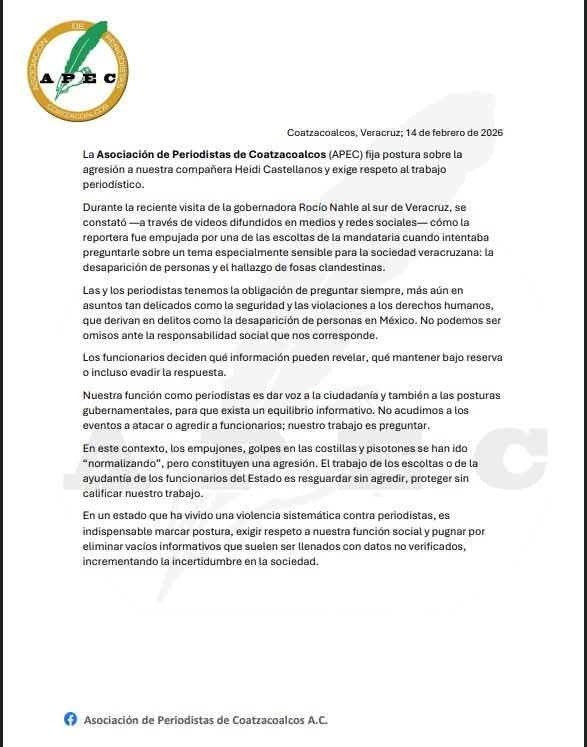 La Asociación de Periodistas de Coatzacoalcos (APEC) fijó postura pública ante la agresión sufrida por la reportera Heidi Castellanos durante la reciente visita de la gobernadora Rocío Nahle al sur del estado, y exigió respeto irrestricto al ejercicio periodístico.