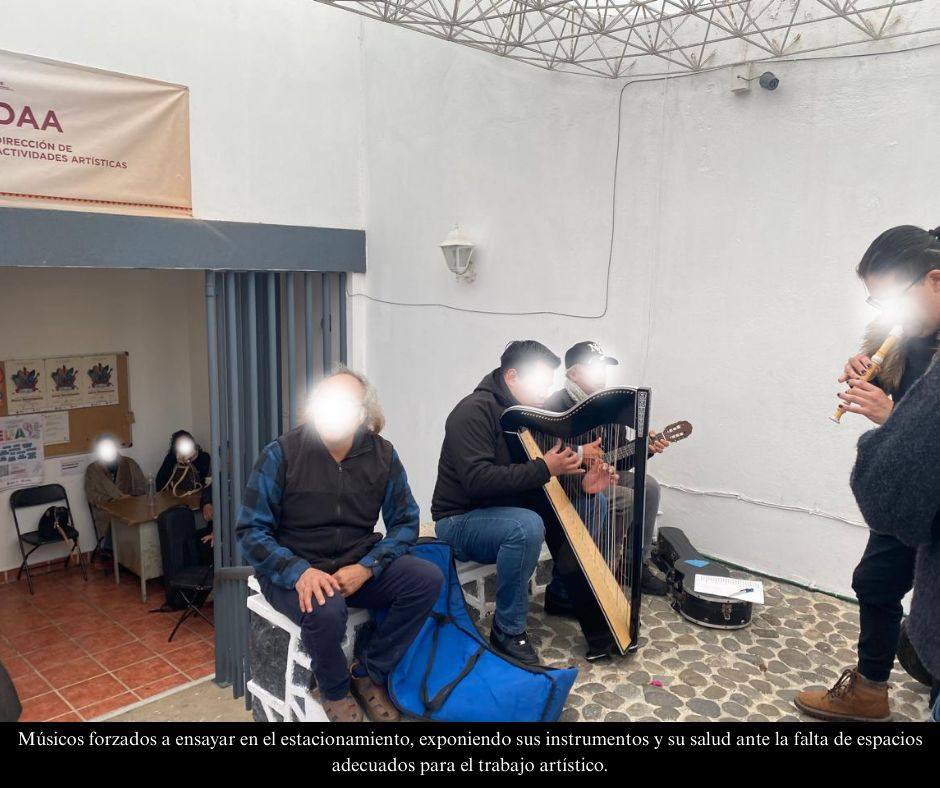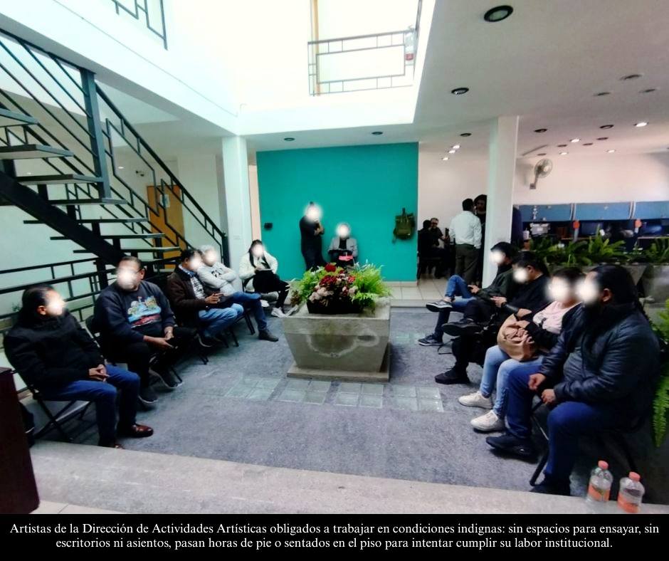 A este escenario se suman condiciones materiales calificadas como indignas, artistas con trayectoria nacional e internacional laboran sin equipos de cómputo, sin escritorios y sin espacios adecuados, pasando jornadas completas de pie o sentados en el piso, una situación que contrasta con el discurso oficial que coloca a la cultura como eje del desarrollo social.